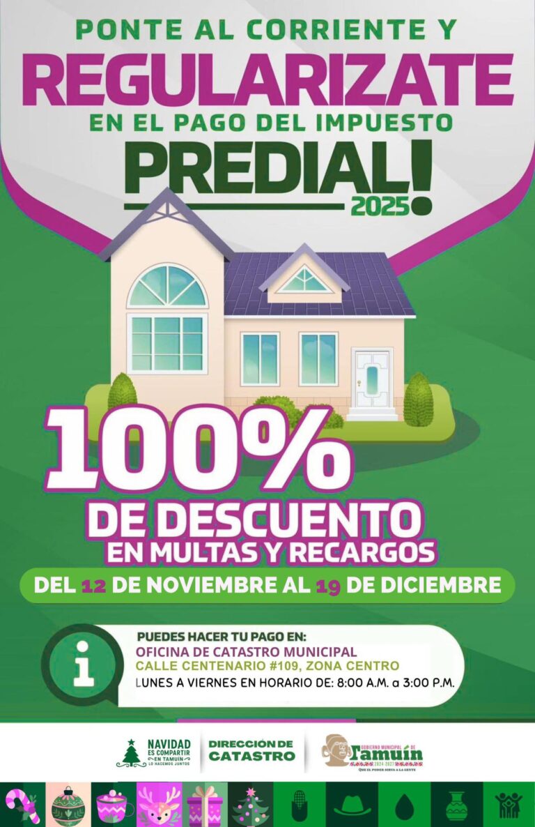 HuastecaDescuentos del 100% en multas y recargos del predial ofrece el Ayuntamiento de TamuínMagui Lópezdiciembre 1, 2025