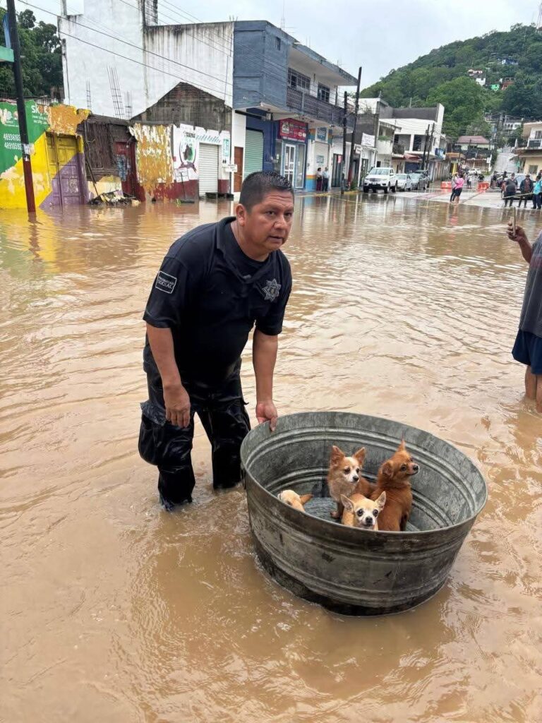 Policías municipales de Axtla de Terrazas rescatan perritos en la plaza principal, que se encuentra inundada por el desbordamiento del…