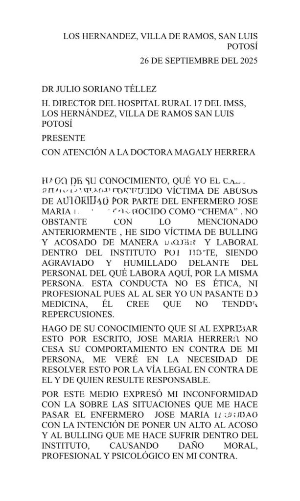 A través de un documento dirigido al director del Hospital Rural No. 17 del Instituto Mexicano del Seguro Social (IMSS), ubicado en la comunidad “Los Hernández” en el municipio de Villa de Ramos, un médico pasante que realiza su residencia en dicho nosocomio denunció ser víctima de @cos0 s3xu@l, laboral y bullying por parte de un enfermero identificado como José María “N”, conocido como “Chema”, quien labora en esta clínica.