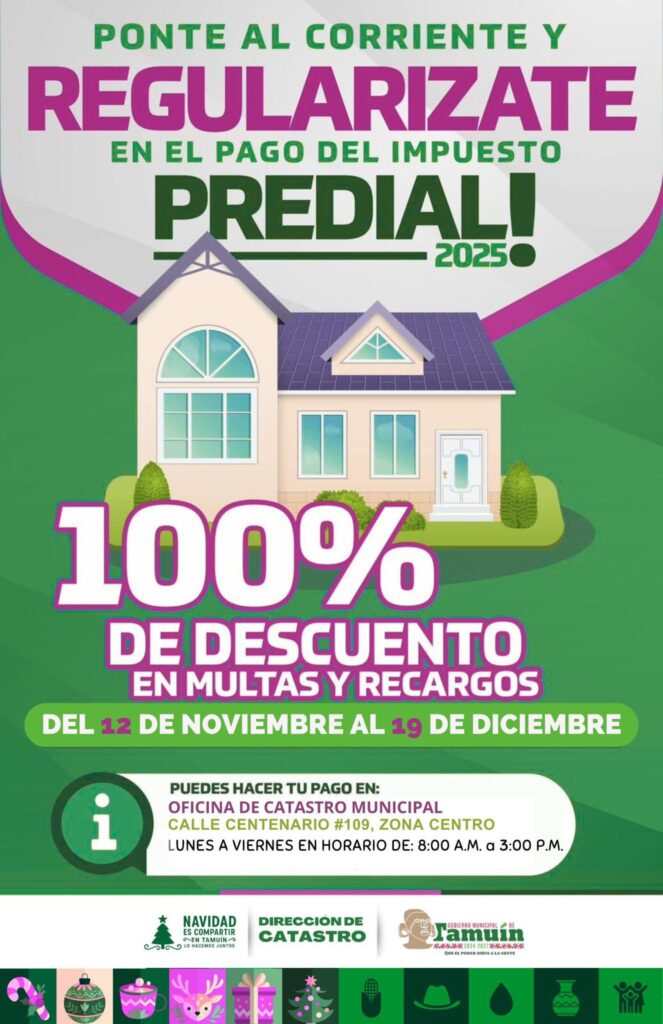 El Gobierno Municipal de Tamuín, que preside Marcelino Bautista Rincón, a través de la dirección de Catastro a cargo del Tec. Marcos Ivan Balderas Rodriguez, te invitan a aprovechar el 100% de descuento en multas y recargos de predial.