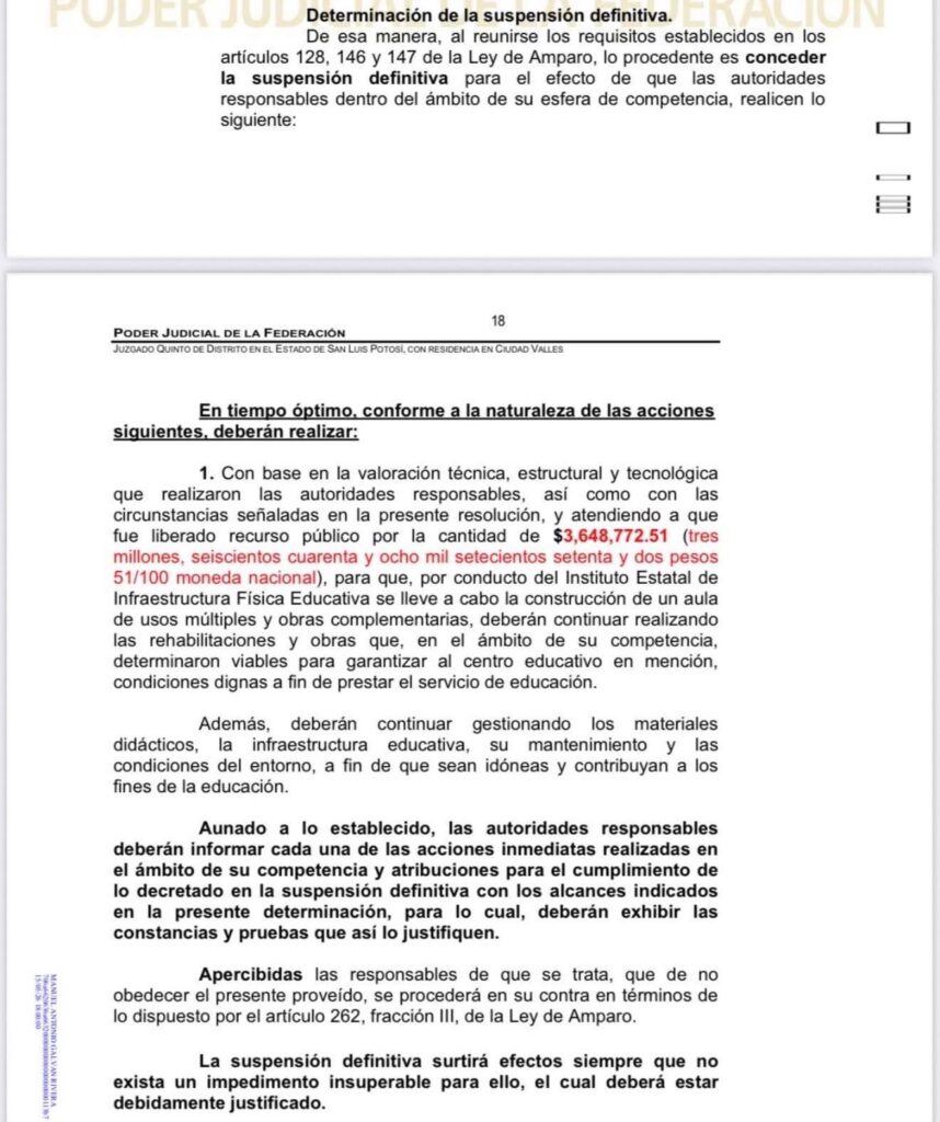 Tras meses de espera, madres de familia apoyados por la Asociación Civil “Perteneces A.C” lograron que un juez federal concediera una suspensión definitiva que ordena que se gestionen materiales didácticos, se mejore la infraestructura educativa y se construya un aula de usos múltiples, además de continuar con las obras necesarias para garantizar un espacio escolar digno en el preescolar comunitario “Benito Juárez” en el ejido Tanculpaya.